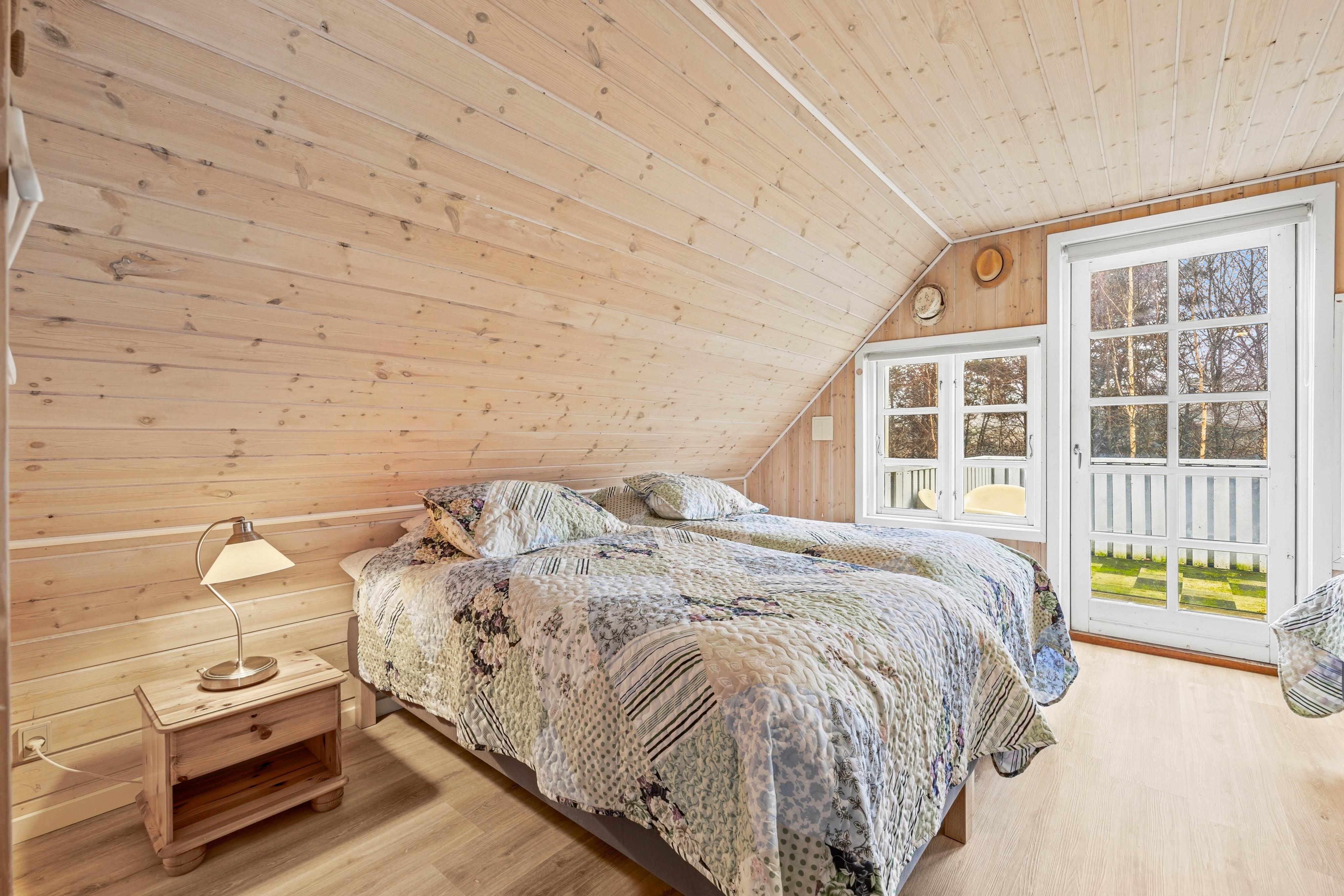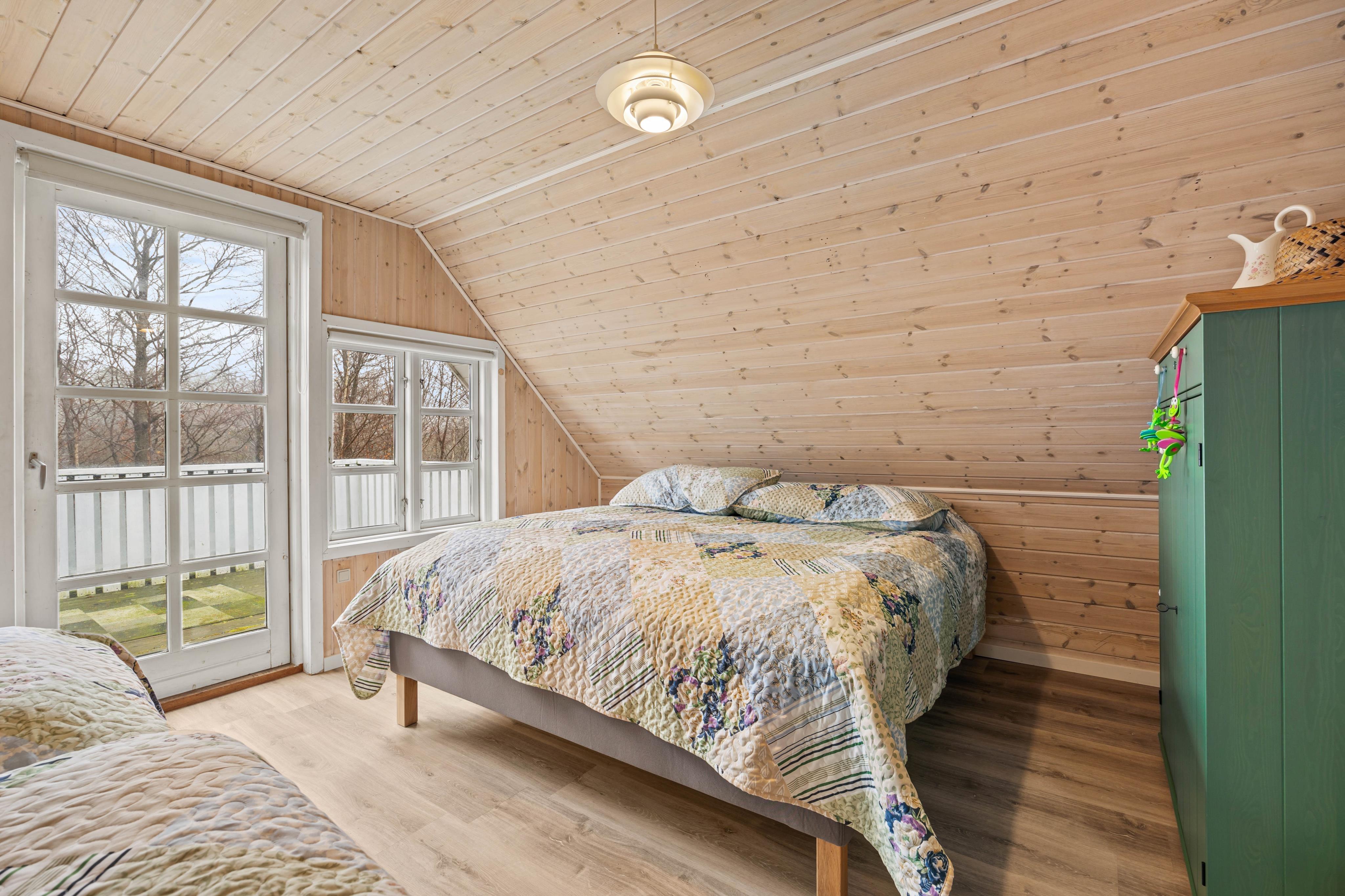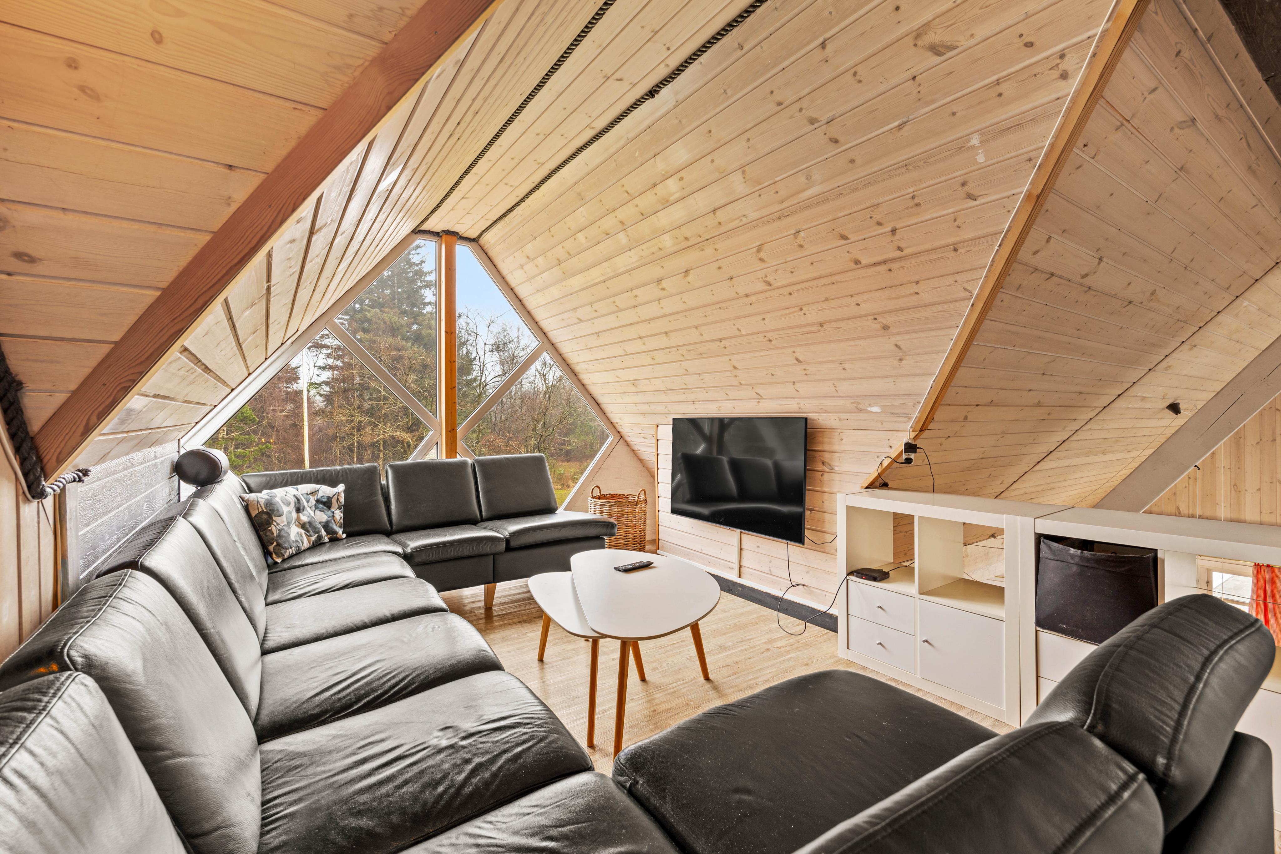 If you follow the stairs up to the first floor, you’ll find another open living area with a large sofa and a TV, ideal for shared evenings. This is also where the large bedroom is located, with 1 double bed and 2 single beds.
