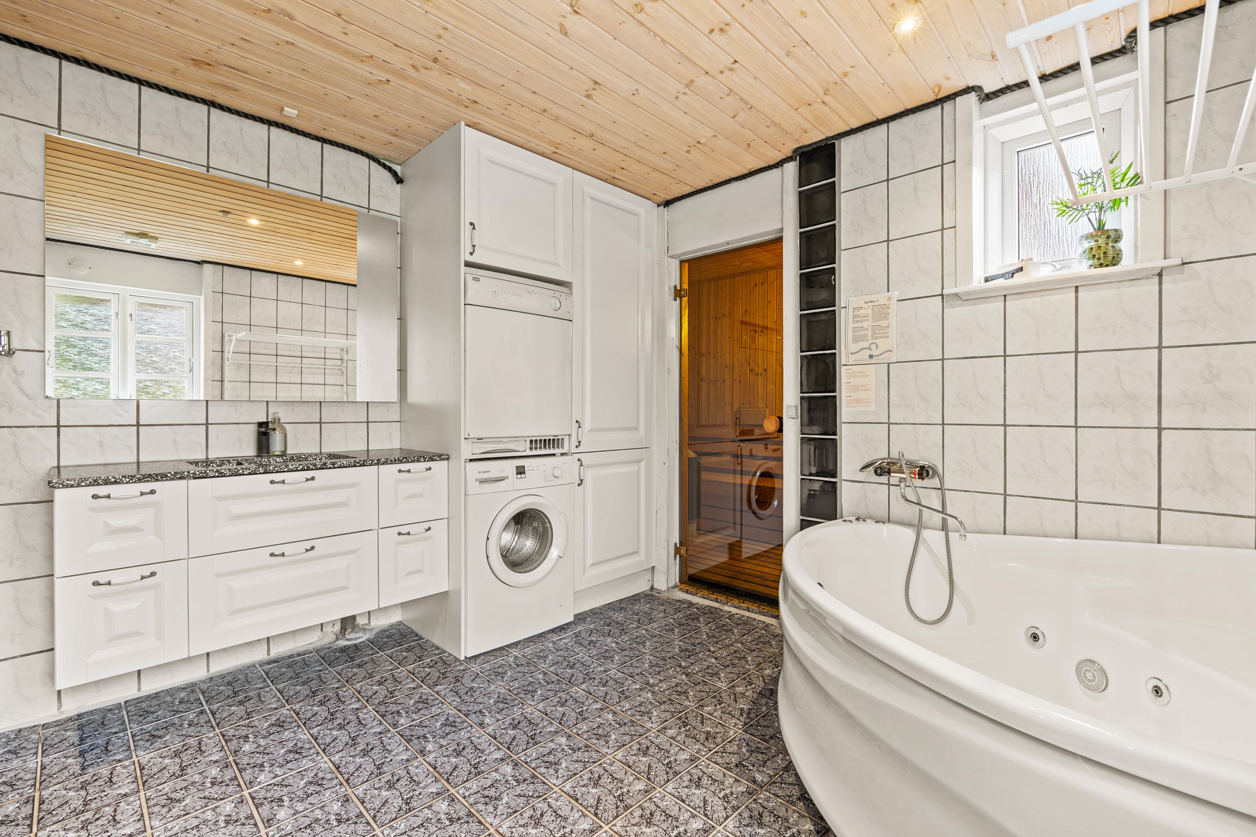 Relax on the idyllic natural plot with an inviting outdoor sauna and a hot tub. In the large bathroom you’ll find a whirlpool for additional wellness moments, helping you unwind after an exciting day in the fresh air.