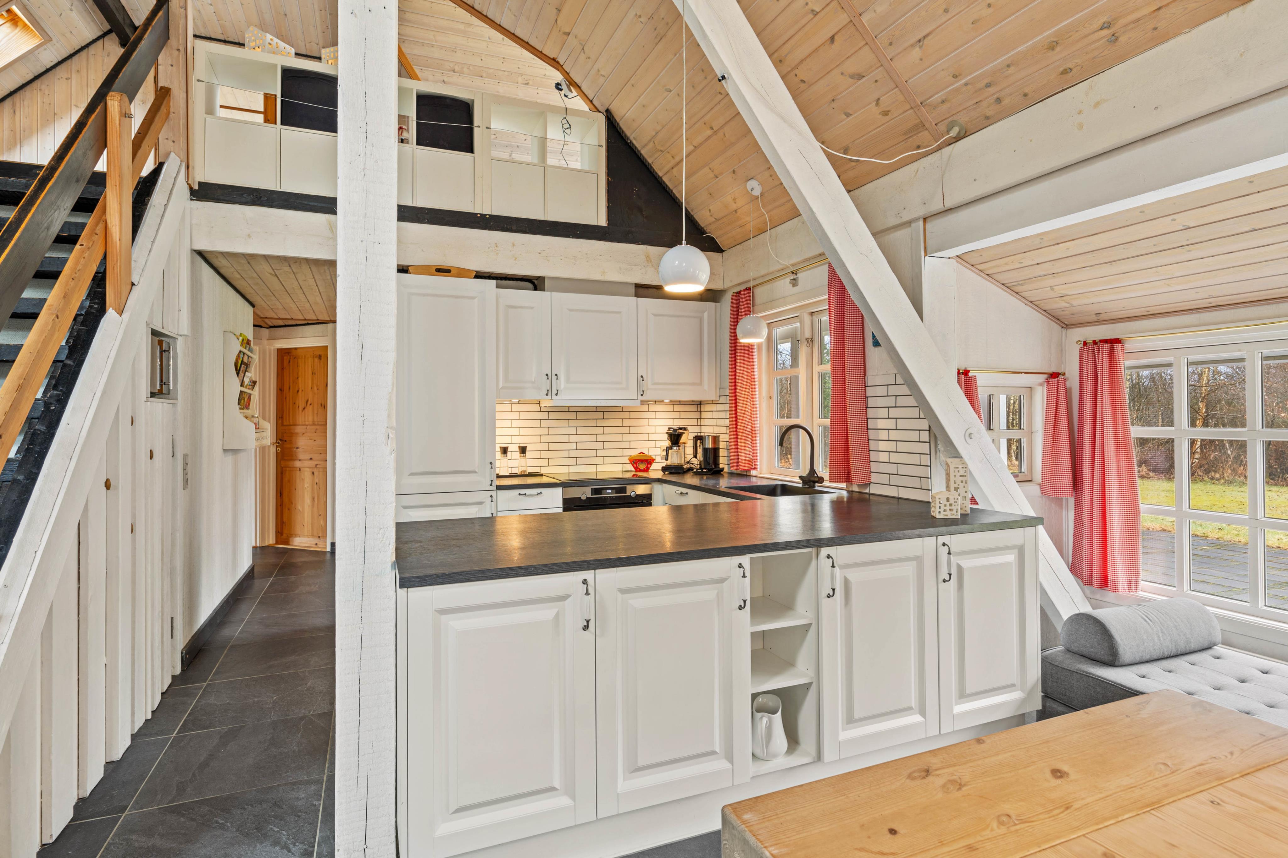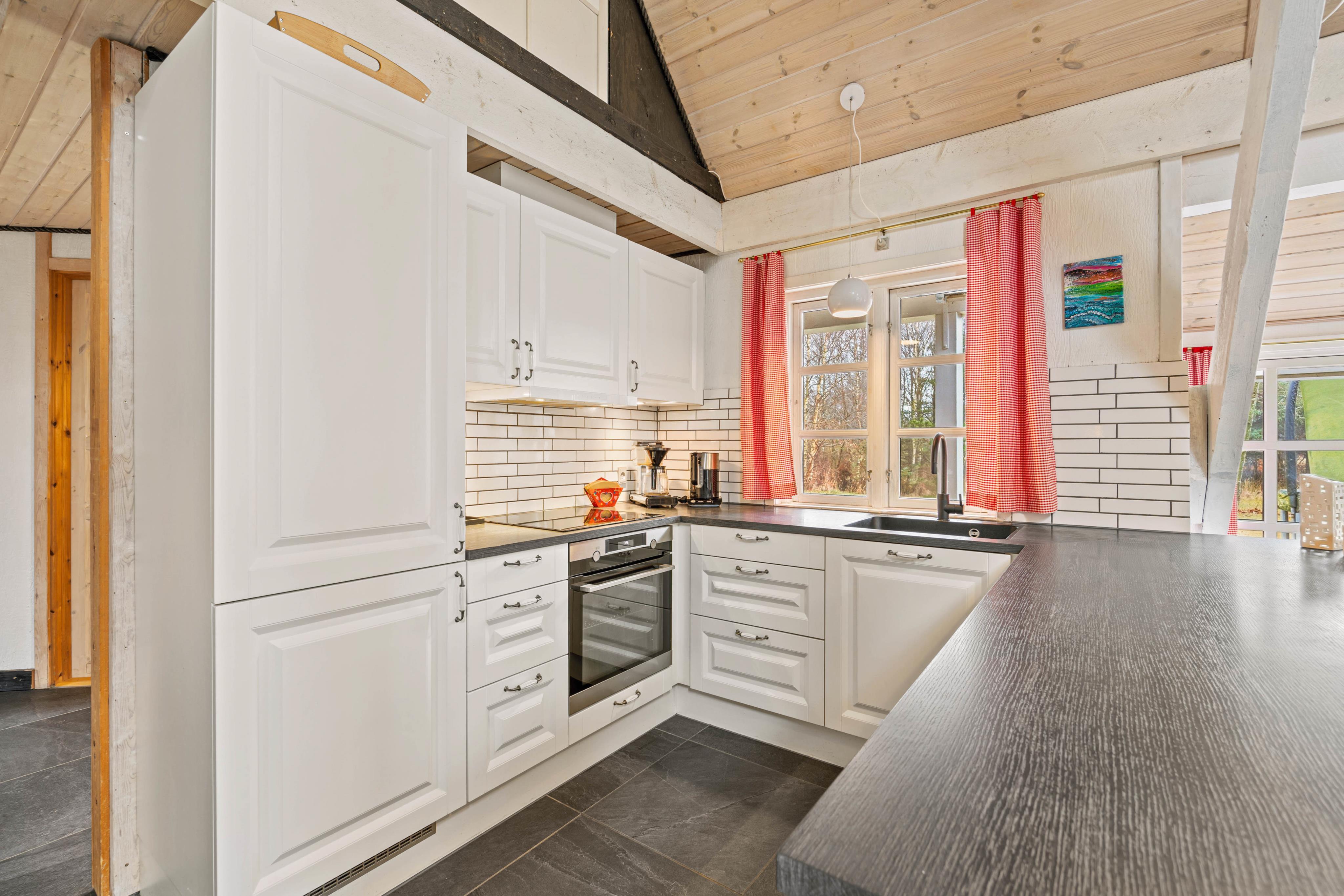 You’ll also find the spacious dining area as well as the lovely open kitchen on the ground floor. The modern kitchen is fully equipped with a dishwasher, microwave, a refrigerator with 80 l freezing capacity, and an electric stove, and invites you to enjoy sociable cooking evenings.