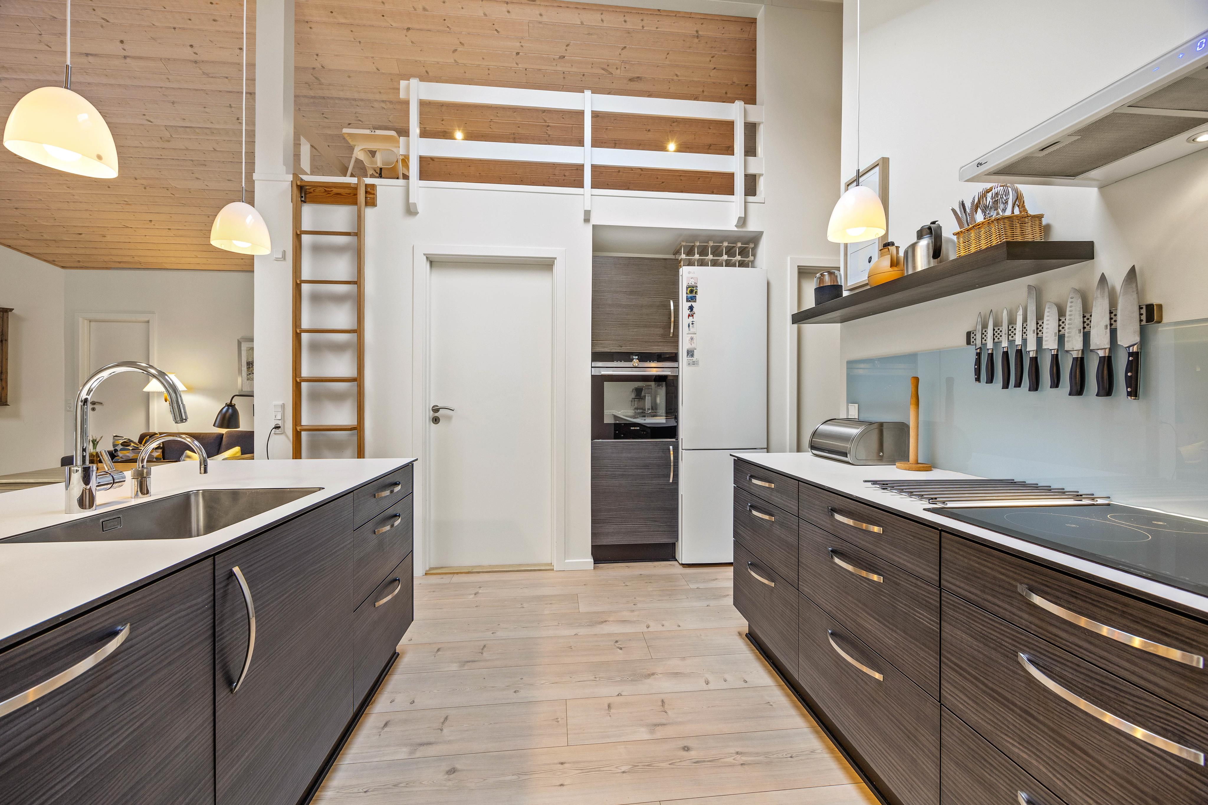 The open, fully equipped kitchen is the heart of the home. With a separate 50-liter freezer, dishwasher, and washing machine, everything you need for a comfortable stay is provided. Prepare your favorite meals and enjoy them at the cozy dining area by the large windows or on the sunny terrace.