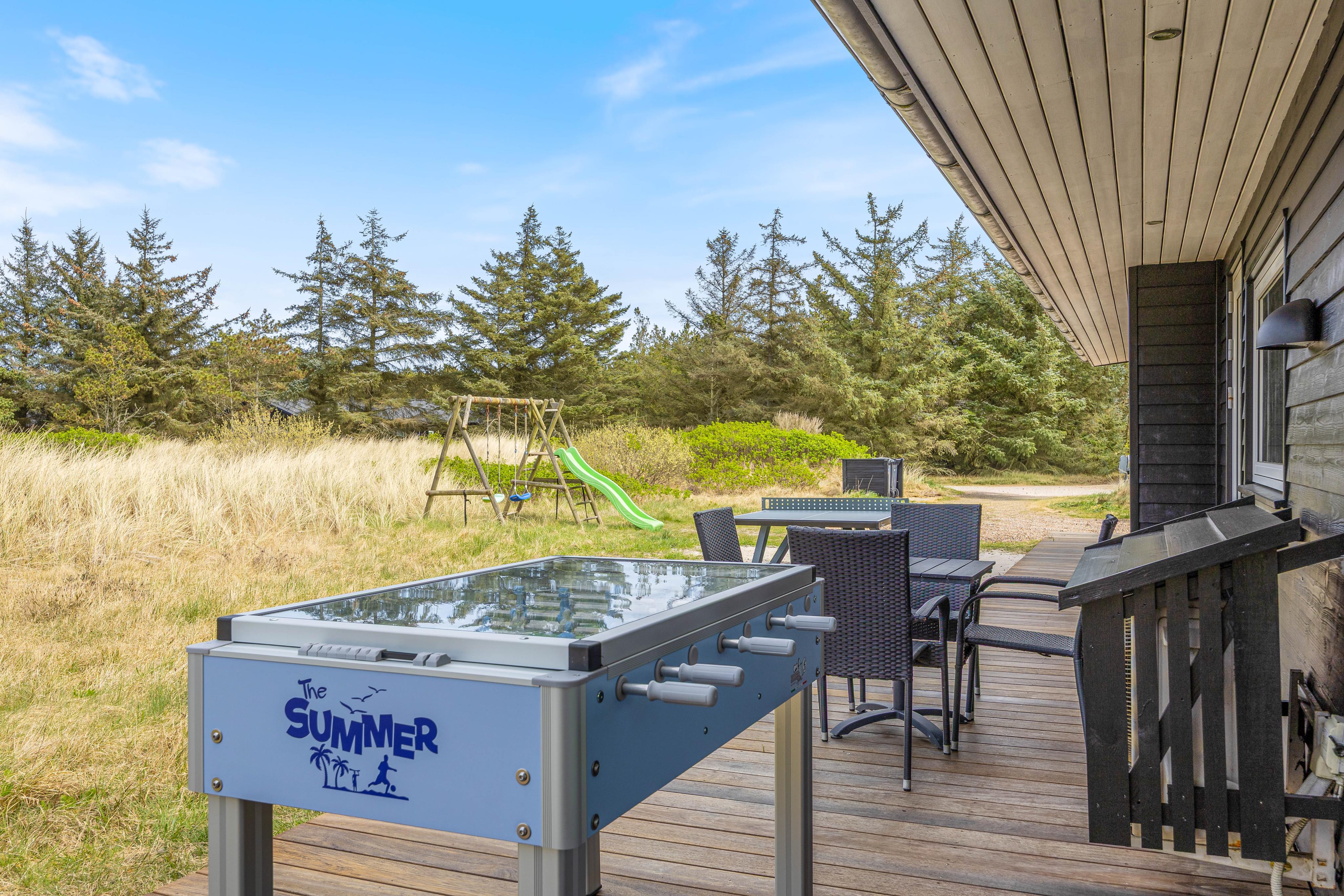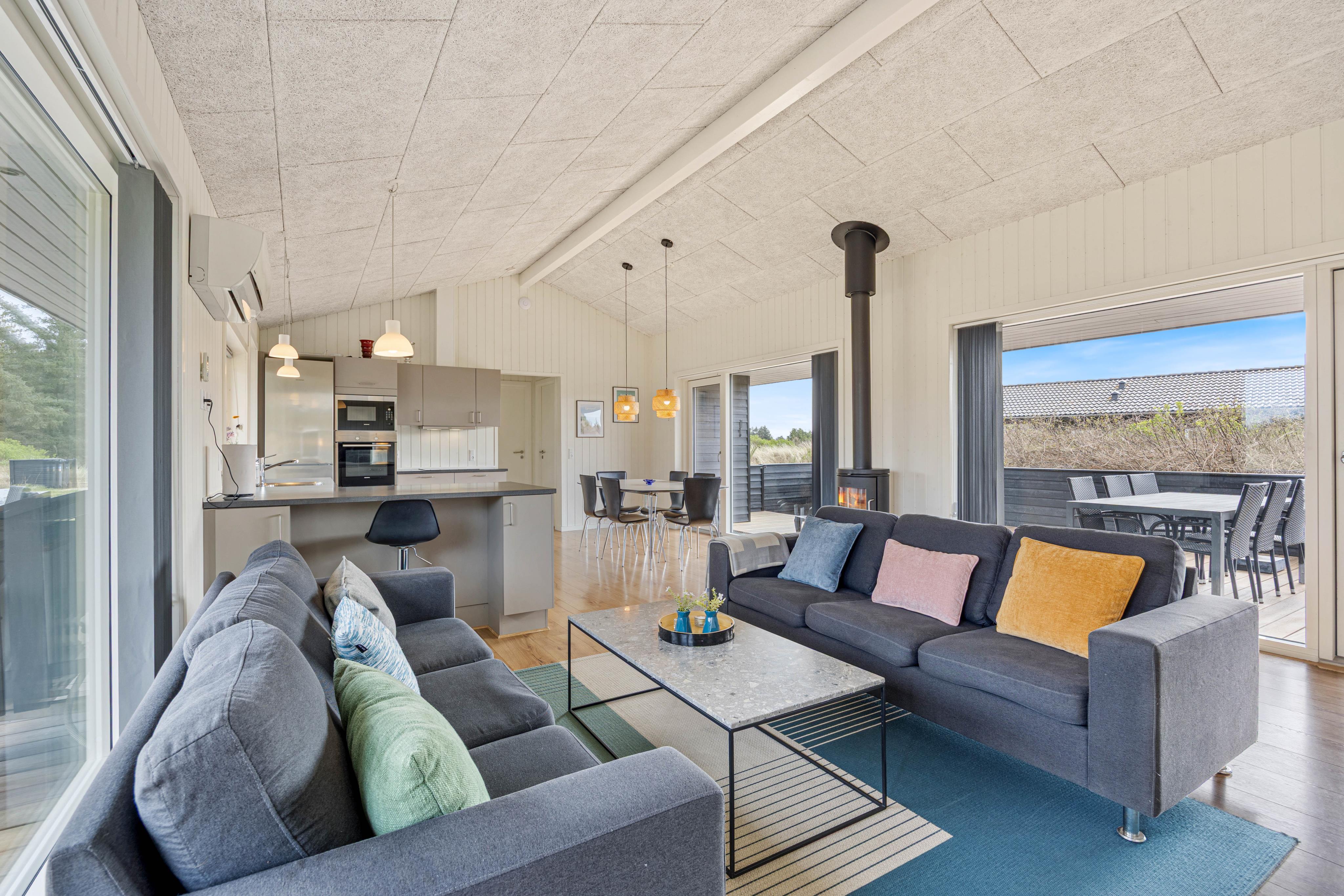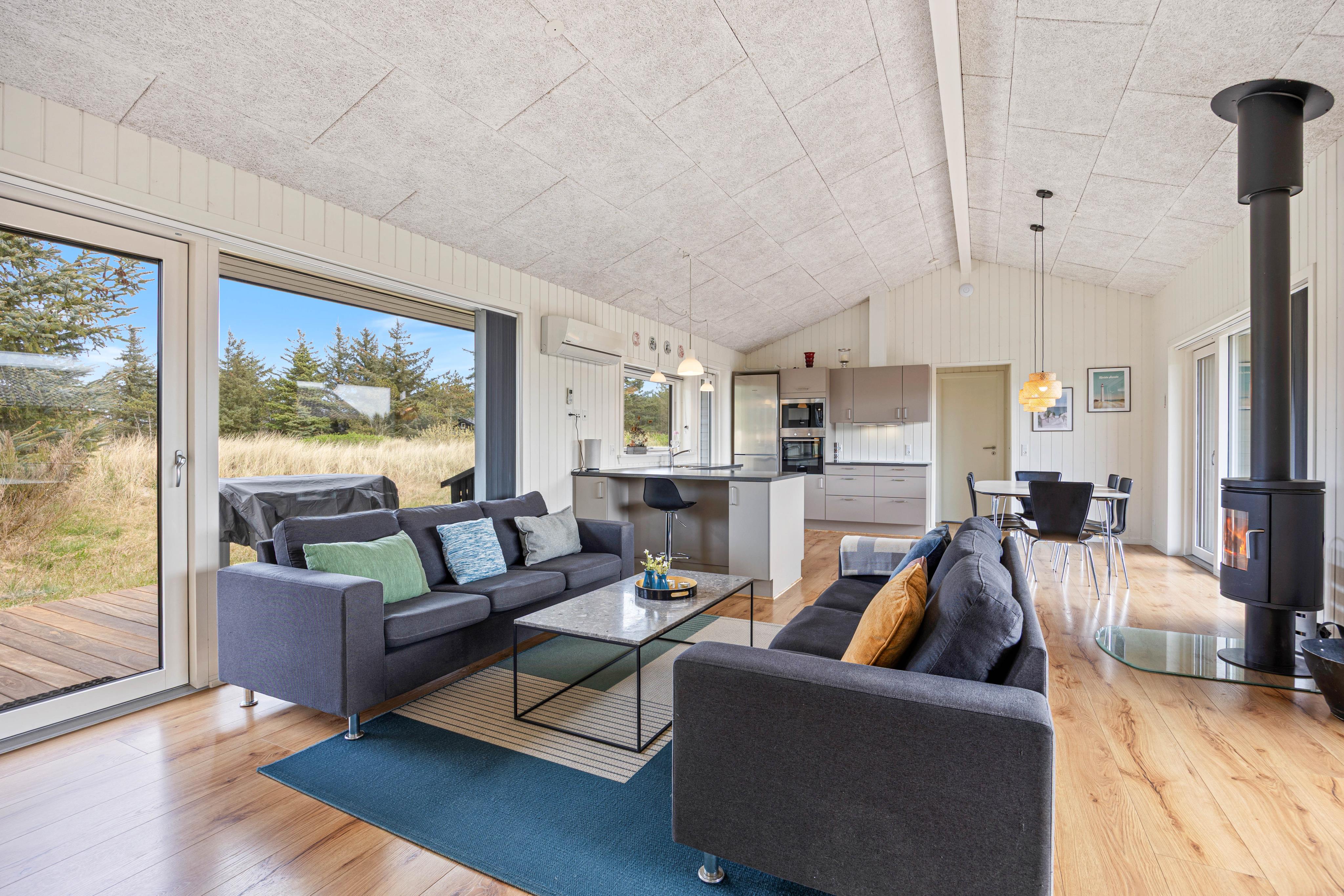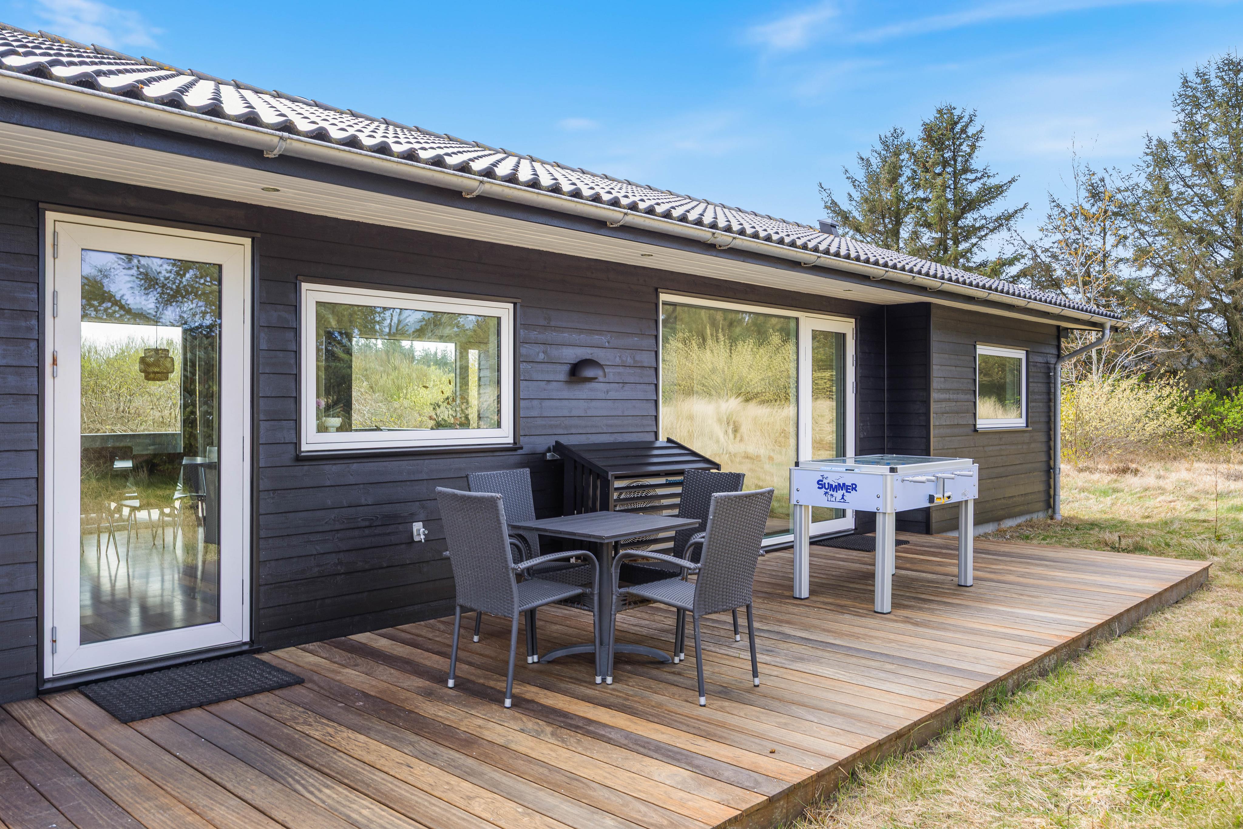 The spacious, well-equipped open-plan kitchen and living area forms the heart of the summer house, where you can gather for communal cooking, cosy movie nights on the sofa, or social games. There is also a foosball table and table tennis, providing extra fun for both children and adults. Light the wood-burning stove and enjoy the crackling flames in the background – creating that authentic hygge atmosphere.