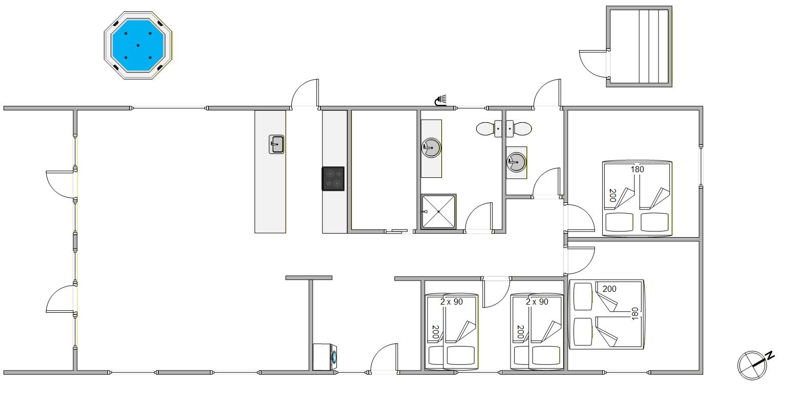 With a living area of 120 m², the holiday home comfortably accommodates up to 6 guests. There are 3 bedrooms, 2 furnished with double beds and the third with 2 bunk beds. For added convenience, the house features 1 bathroom and 1 guest toilet – both with floor heating.