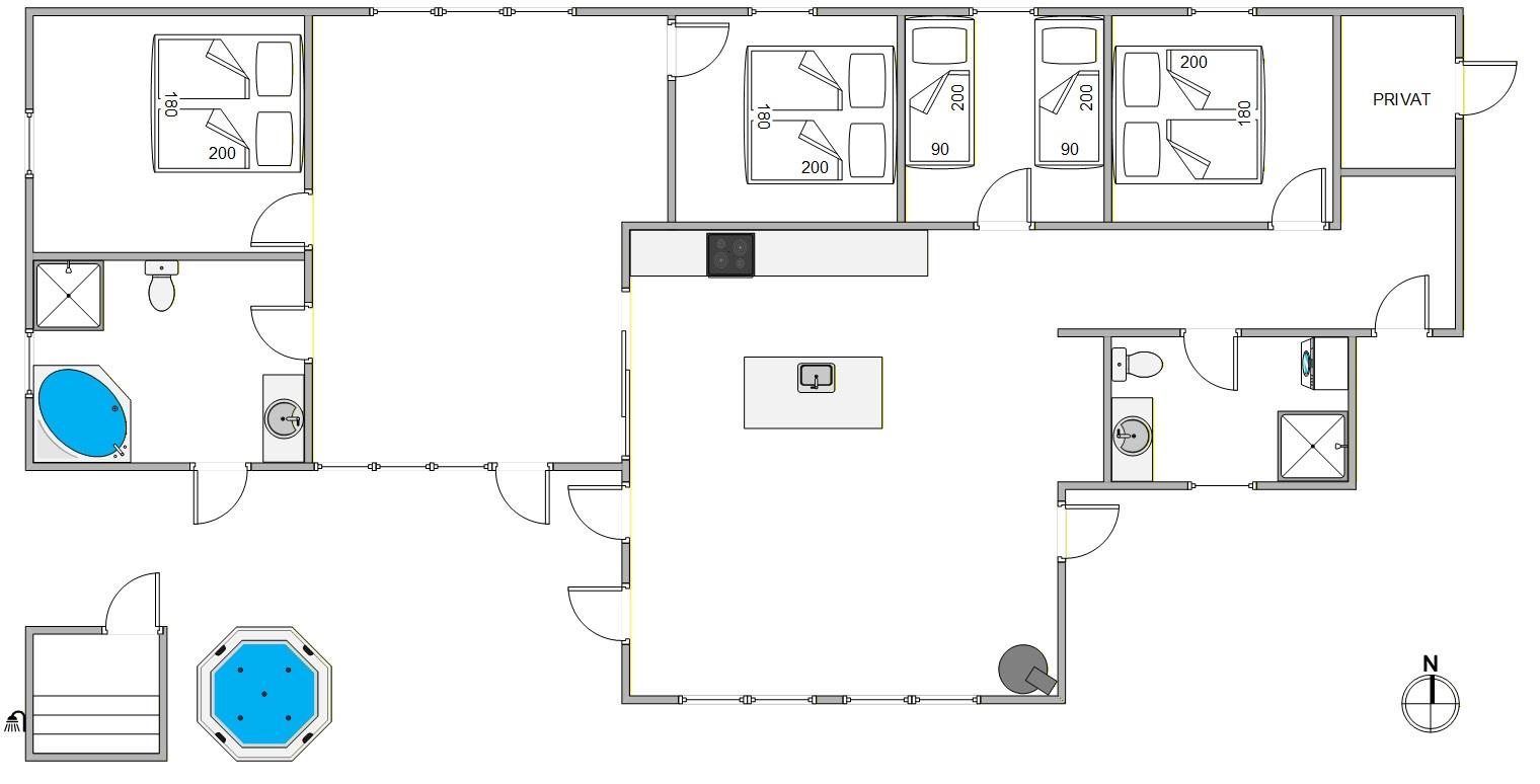 The holiday home benefits from an efficient heat pump and excellent insulation, allowing for energy-efficient heating throughout. The entire holiday home features underfloor heating that can be controlled room by room. The outdoor hot tub fills and heats automatically at the touch of a button. The two premium bathrooms prevent morning queues. Throughout the living space and all four bedrooms, you'll find easy-care designer flooring.