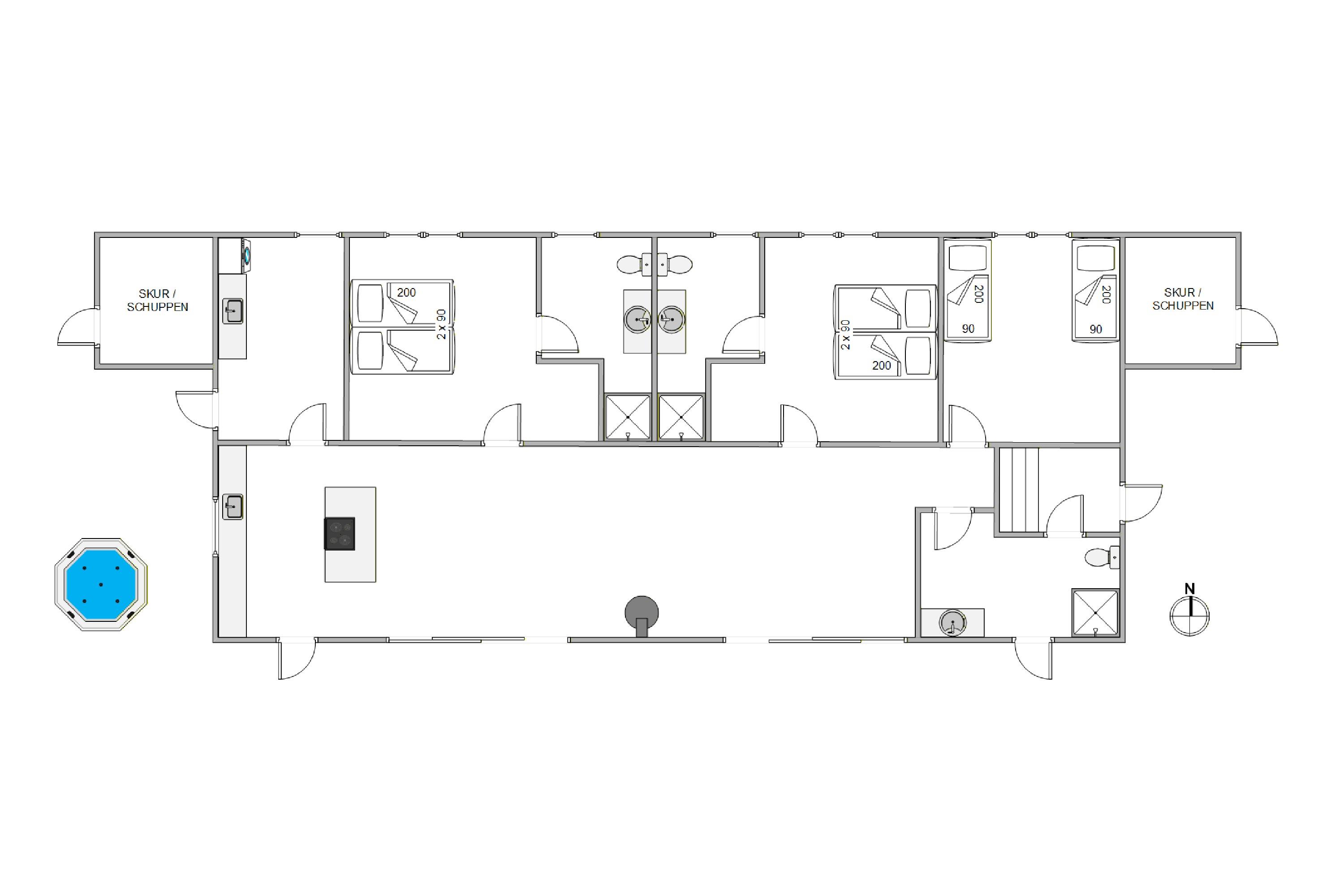 A great holiday home: Modern, close to the beach, and family-friendly This modern and well-kept holiday home scores with its prime location near the beach and a light-flooded, stylish interior. The kitchen is excellently equipped and leaves little to be desired. For maximum comfort, there are two bedrooms each with their own bathroom and shower, complemented by a third room with two single beds – ideal for families or friends. The large main bathroom offers direct access to the terrace and features a delightful small sauna for relaxing moments. A special highlight is the refreshing cascade shower in the outdoor area on the terrace. The huge terrace invites you to linger with a cozy lounge area under a practical louvered roof/pergola. Next to it, you will find a comfortable seating group and sun loungers for relaxing in the sun. For the ultimate relaxation, there is also a wonderful outdoor hot tub available. The lovingly landscaped outdoor area is a paradise for both young and old: A large, in-ground trampoline, a swing set with slide, and a superb fire pit guarantee fun, play, and unforgettable evenings under the open sky.